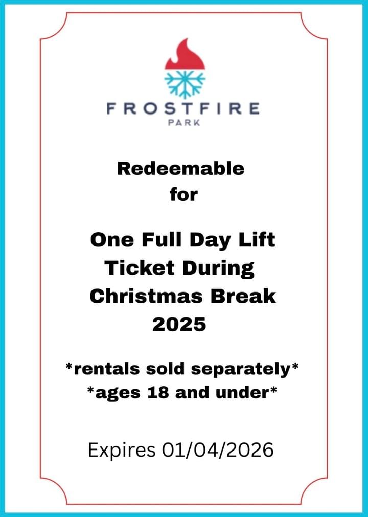 Show this image to redeem at the lodge for your lift Pass, either at Rentals or the Bar. Must sign the waiver as well